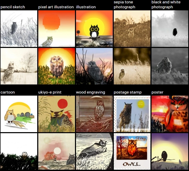 Resultados de la solicitud: “una imagen de un búho sentado en un campo al amanecer” nótese los diferentes estilos interpretados por la IA.